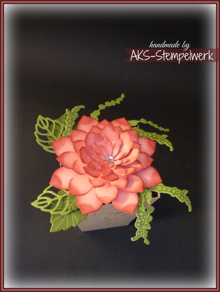Als „Topf“ habe ich die Popcornschachtel verwendet, in savanne, dezent bestempelt und mit etwas Kies beschwert, damit das Ganze auch schön Stand hat. Neben dem Sukkulenten-Set kam für die Blätter auch das Set „Besondere Grüße“ zum Einsatz. Beides gibt es zur Zeit als Sparpaket  10 % günstiger im Katalog.