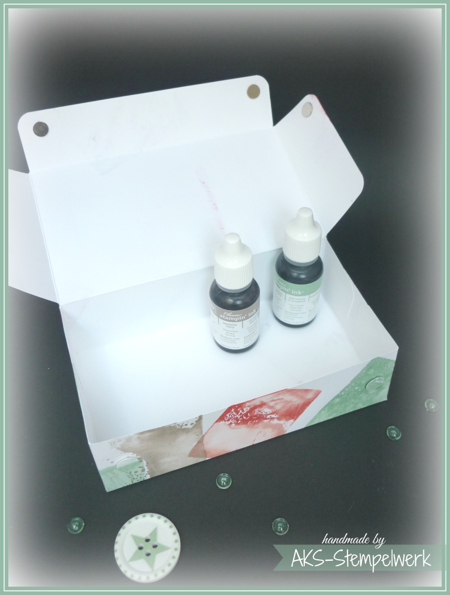 Da passt einiges hinein und man hat nicht viel Verschnitt. Ihr braucht dazu nur das Stanz- und Falzbrett für Geschenktüten und für das selbstgemachte Designerpapier die Acrylblöcke und den Stampin‘ Spritz. Den Block einfach in das Stempelkissen drücken, die Farbe mit dem Wasser aus dem Stampin‘ Spritz besprühen und ab damit auf’s Papier. Je mehr Wasser ihr drauf spritzt, desto mehr verläuft auch die Farbe und Ihr erhaltet Euer ganz individuelles Papier.