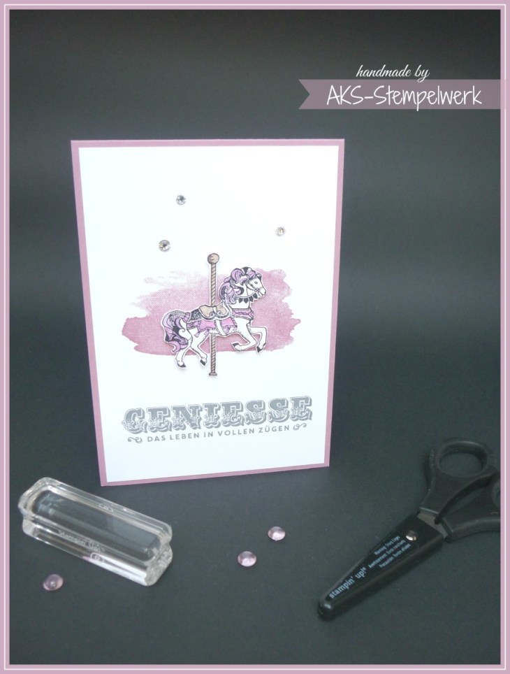 Als ich im November 2016 auf der On Stage in Düsseldorf (–> eine ganz tolle Veranstaltung von Stampin‘ Up mit so viel Input und wundervollen Leuten und neuen Bekanntschaften) das erste mal den Frühjahr-Sommerkatalog in den Händen hielt und durchblätterte, fiel mir dieses Set „Carousel Birthday“ sofort auf und war ein absolutes Must Have auf meiner Liste. Ich kann Euch nicht mal genau den Grund dafür erklären, aber ich hatte mich spontan verliebt 😉