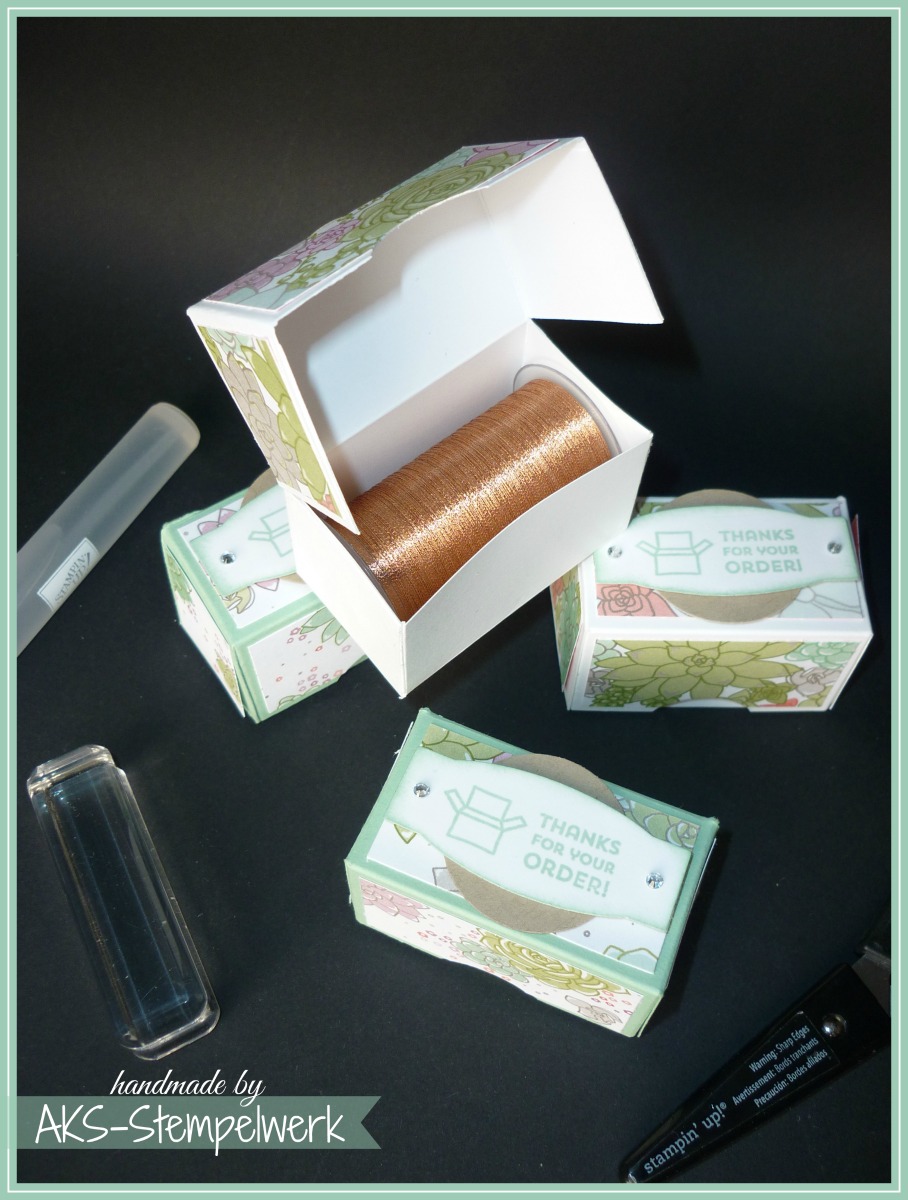 Ich habe kleine Boxen mit dem farblich passenden Karton in flüsterweiß und minzmakrone (das ja auch jetzt zum Katalogwechsel aus dem Sortiment geht) gemacht, sodass genau 1 Rolle von unserem tollen Metallicgarn hineinpasst, dann mit dem Designerpapier „Sukkulentengarten“ beklebt, ein kleines Greifloch hineingestanzt und ein bißchen verziert. Schon waren die kleinen Goodies fertig.