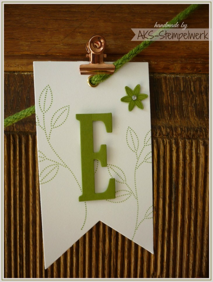 Ich wollte schon immer mal eine Girlande machen und war überrascht wie einfach das geht. Ich habe dafür die „Framelits Banner“ und die „Framelits Große Buchstaben“ verwendet (beide findet Ihr im Hauptkatalog auf S. 193). Den Hintergrund der einzelnen Banner habe ich mit dem Stempelset „So dankbar“ gestaltet. Aus dem Set stammen auch die kleinen Blüten, die Ihr mit der passenden Handstanze „Dreierlei Blüten“ ganz fix ausstanzen könnt. Noch ein paar Strasssteinchen dazu und fertig.
