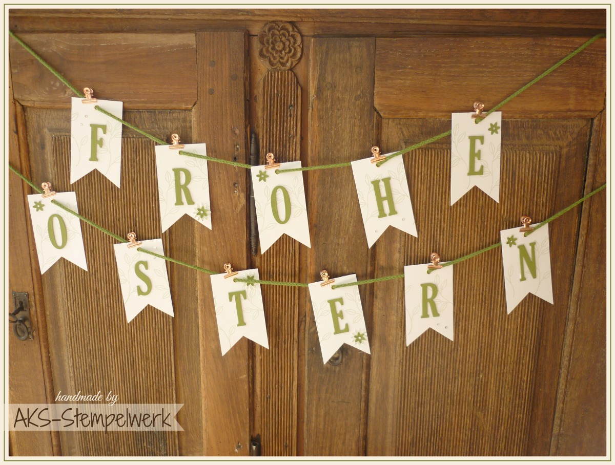 Das Thema unserer Blogparade ist natürlich „Ostern“ und ich habe dazu diese hübsche Girlande in dezenten grün-weißen Frühlingstönen gewerkelt. Denn so langsam darf bzw. sollte auch österlich dekoriert werden und ich bin ja kein Freund der grellen, neonfarbenen Plastikeier 😉
