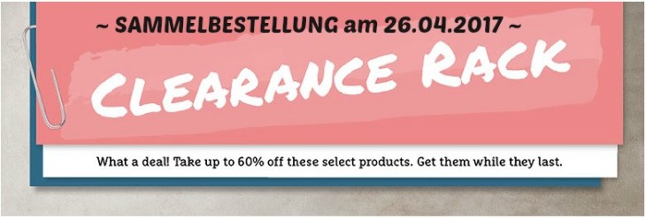 Ich mache morgen eine Sammelbestellung – also gebt mir bitte möglichst zeitnah Eure Wünsche durch. Natürlich auch noch von den Produkten der Auslaufliste, die nicht in den neuen Jahreskatalog übernommen werden. Denn auch wenn schon vieles weg ist, gibt es immer noch genug zu stöbern. (klick)