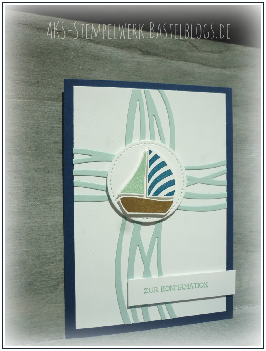 Zum Einsatz kamen vorallem das Stempelset „Swirly Bird“ und die passenden Thinlits „Wunderbar verwickelt“. So ist das Kreuz im Hintergrund entstanden und das kleine Segelboot auf dem Kreis (dieser ist ausgestanzt mit den Framelits „Stickmuster“ –> für alle Big Shot-Besitzer ein kleines must-have).