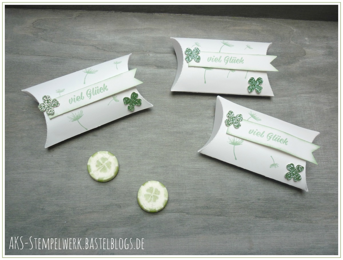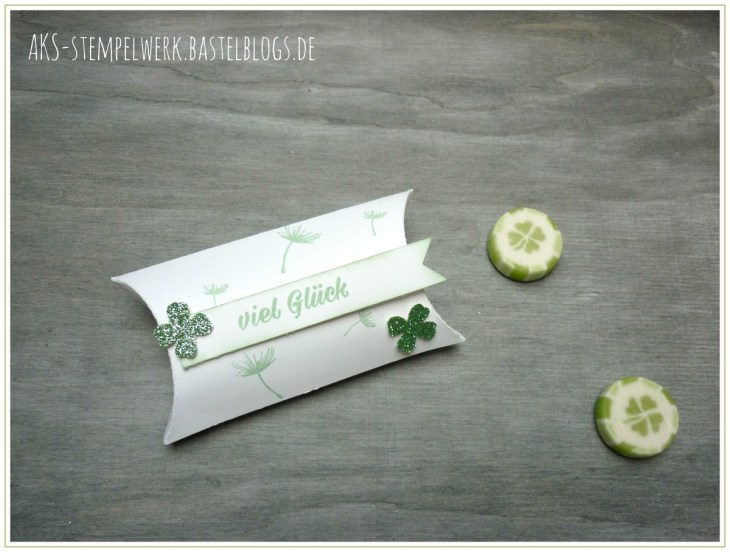 Der Inhalt – die leckeren, grün-weißen „Glücksbonbons“ – stand schon fest, mir fehlte nur noch die geeignete Verpackung. Und auf einmal fiel mir die gute alte Pillowbox-Stanze wieder ein.
