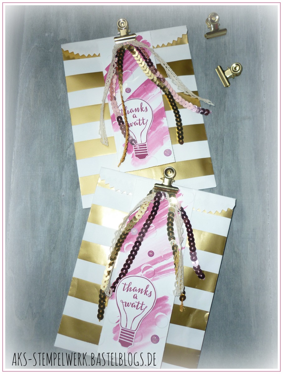 Und der Clou sind natürlich dann immer ein paar hübsche Bänder und Pailletten, die man am Farbkarton festtackern kann und dann beides mit der Buchklemme am Tütchen anklippst. So muss man die Tüte beim Öffnen auch nicht zerstören, was ich immer besonders schade bei Verpackungen finde.