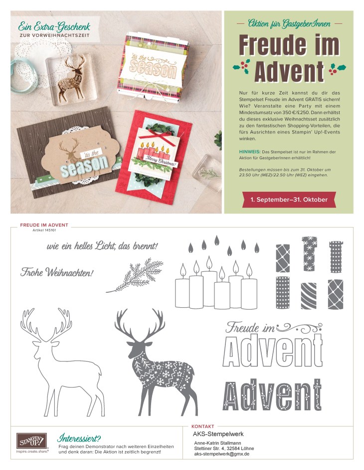 Wenn Ihr also mal wieder Lust auf einen kreativen Abend unter Freunden, Gleichgesinnten oder Neugierigen habt, dann sagt mir gerne Bescheid und wir vereinbaren einen Termin. Bei einem Umsatz von mind. 350 €, gibt es dieses tolle Stempelset für die Gastgeberin gratis! Und das besondere daran: Das Set gibt es nicht zu kaufen, sondern wirklich nur in diesen beiden Monaten gratis als Bonbon!