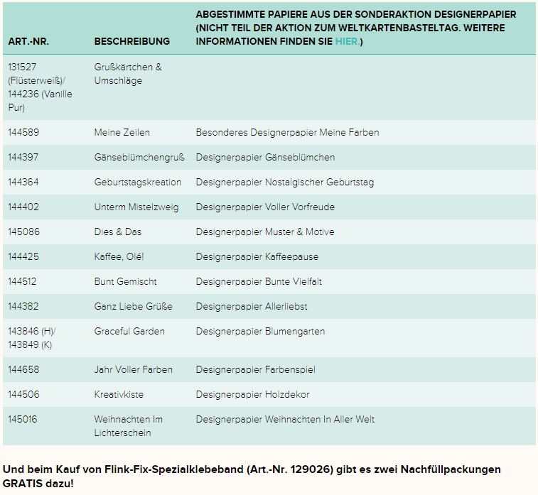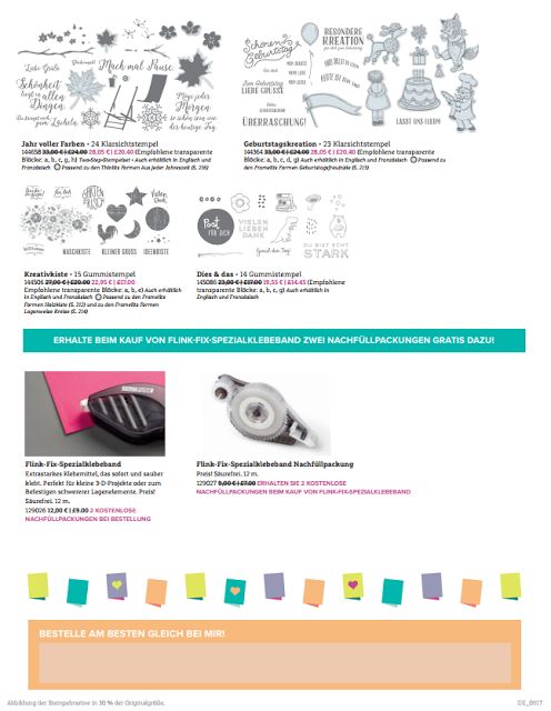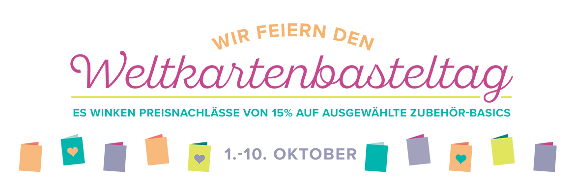 Fangen wir mit der Tatsache an, dass am 7.10. Weltkartenbasteltag ist. Vielleicht hat der ein oder andere von Euch bereits davon gehört oder gelesen? Anlässlich dieses „Feiertages“ hat sich Stampin‘ Up! für uns Kartenbastler etwas Besonders ausgedacht: Es gibt nämlich vom 1.-10.Oktober auf folgende Stempelsets, Grußkärtchen und Umschläge 15 % Rabatt!!! Zusätzlich gibt es beim Kauf eines Flink-Flix-Spezialklebebandes 2 Nachfüllpackungen gratis dazu!!! Wohooo!!!
