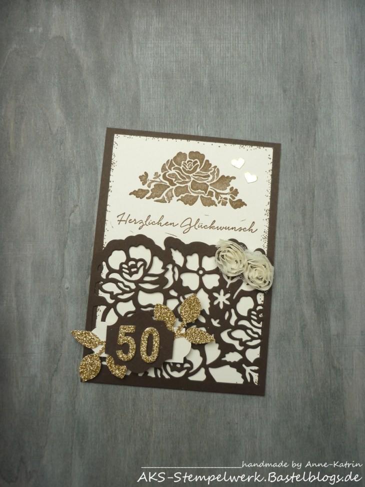 Grund genug, die Zeit zu nutzen, um mal wieder einen Beitrag online zu stellen… und zwar habe ich hier noch eine Karte + Deko zu einer goldenen Hochzeit liegen 😉