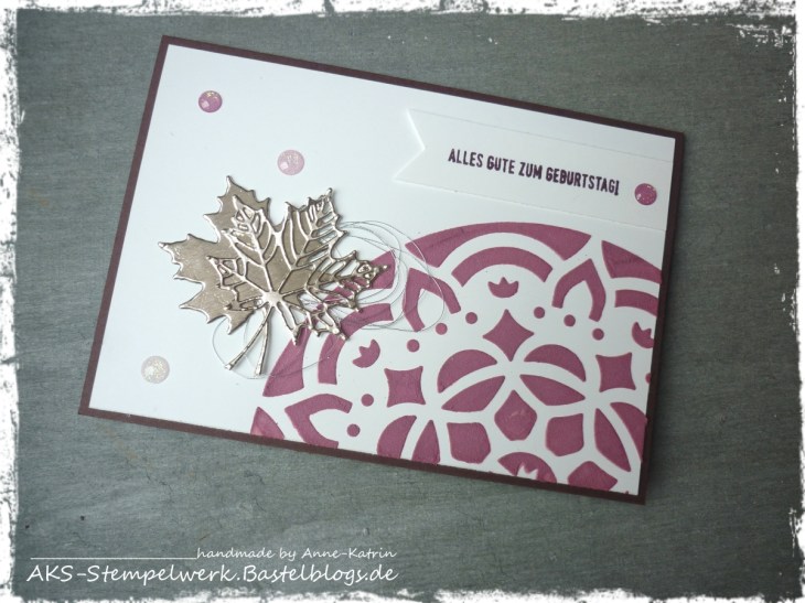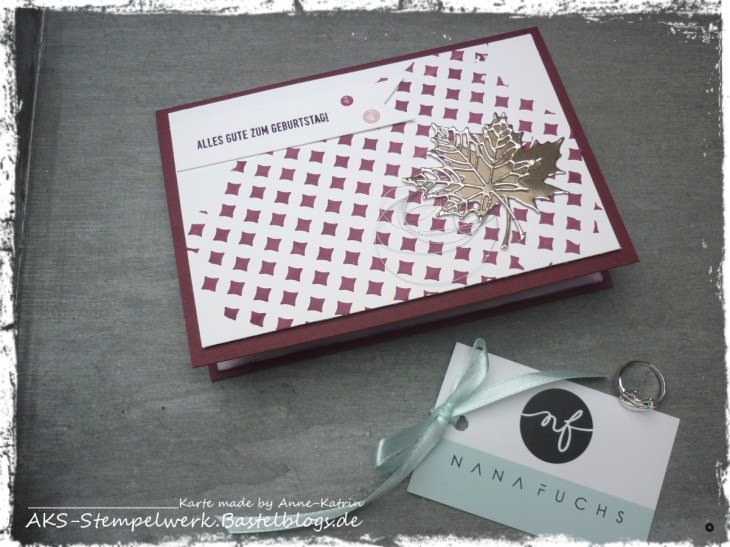 Dann die zur Zeit bei mir obligatorischen Blätter aus dem Thinlits-Set „Aus jeder Jahreszeit“; diesmal aus unserem Metallic-Folienpapier Champagner (Herbst-Winterkatalog, S. 37), das silberfarbene Metallicgarn und ein paar Lackakzente – fertig!