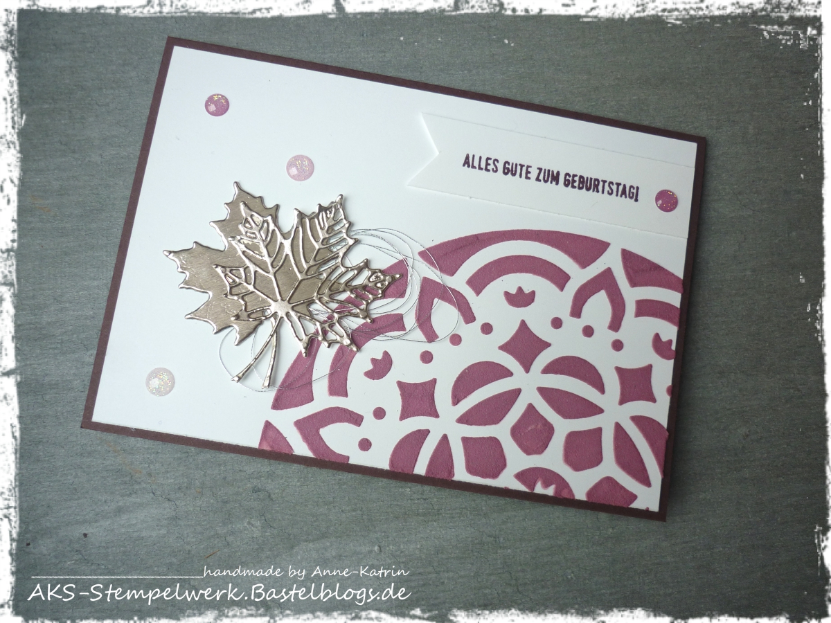 Auf dieser Karte seht Ihr noch ein anderes Muster aus dem 4er-Set „Dekoschablonen Muster-Mix“ (S. 201 im Hauptkatalog). Das macht echt so einen Spaß damit – irre!
