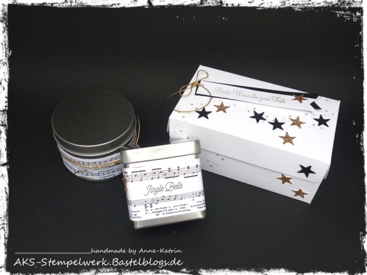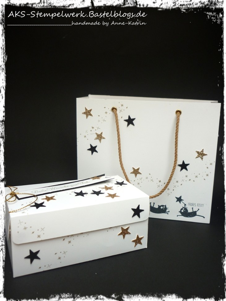 Bestempelt habe ich die Verpackungen mit ein paar süßen Figuren von „cats on appletrees“ und den Sternen aus dem Set „Wie ein Weihnachtslied“. Dazu gab’s noch ein paar ausgestanzte Sterne  in schwarz und dem goldenen Glitzerpapier.