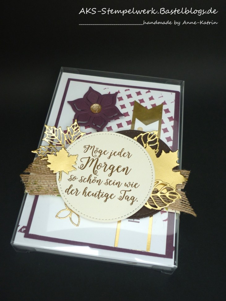 Ein bißchen Strukturpaste ist zum Einsatz gekommen, ein bißchen Goldfolie als kleines Fähnchen und Blüten (auch aus dem Thinlitsset „Blütenpoesie“) und natürlich wieder die InColor feige. Da bin ich in diesem Herbst einfach nicht drumherum gekommen. Mal sehen wie es zur Weihnachtszeit wird.