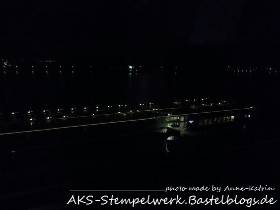 Als ich endlich mein Zimmer näher in Augenschein nehmen konnte, war es draußen natürlich längst stockdunkel, dennoch war der Blick auf den Rhein atemberaubend. Sogar ein erleuchtetes „Hotelschiff“ lag direkt vor Anker.