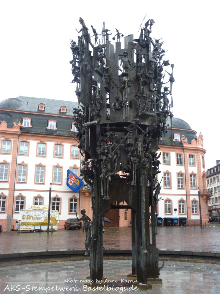 Das hier ist der berühmte Fastnachtsbrunnen auf dem Schillerplatz! Das Denkmal soll die närrische Jahreszeit symbolisieren, ist fast neun Meter hoch und mit mehr als 200 bronzenen Figuren und Allegorien versehen: Vater Rhein, der Mönch, der Narr mit seinen Attributen, der Harlekin und der Mann mit dem Brett vor dem Kopf, die Katze, Till Eulenspiegel, der Hanswurst und die Stadtgöttin Moguntia, der Geldbeutelwäscher, Vaganten, Schwellköpp oder Possenreißer und Gaukler sind nur einige der Motive, die einen starken Bezug zur Mainzer Stadt- und Fastnachtsgeschichte aufweisen. Auch Rebenranken sowie Weck, Worscht un Woi sind vertreten.