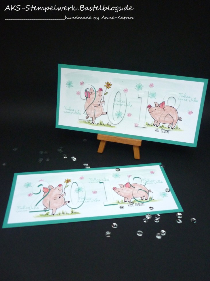 Natürlich sind die „Glücksschweinchen“ (Hauptkatalog S. 48) zum Einsatz gekommen und die „Framelits Große Zahlen“ (Hauptkatalog S. 215), mit denen ich die Technik „fliegende Buchstaben bzw. hier Zahlen“ auf die Karte gezaubert habe.