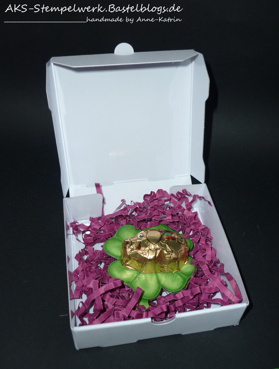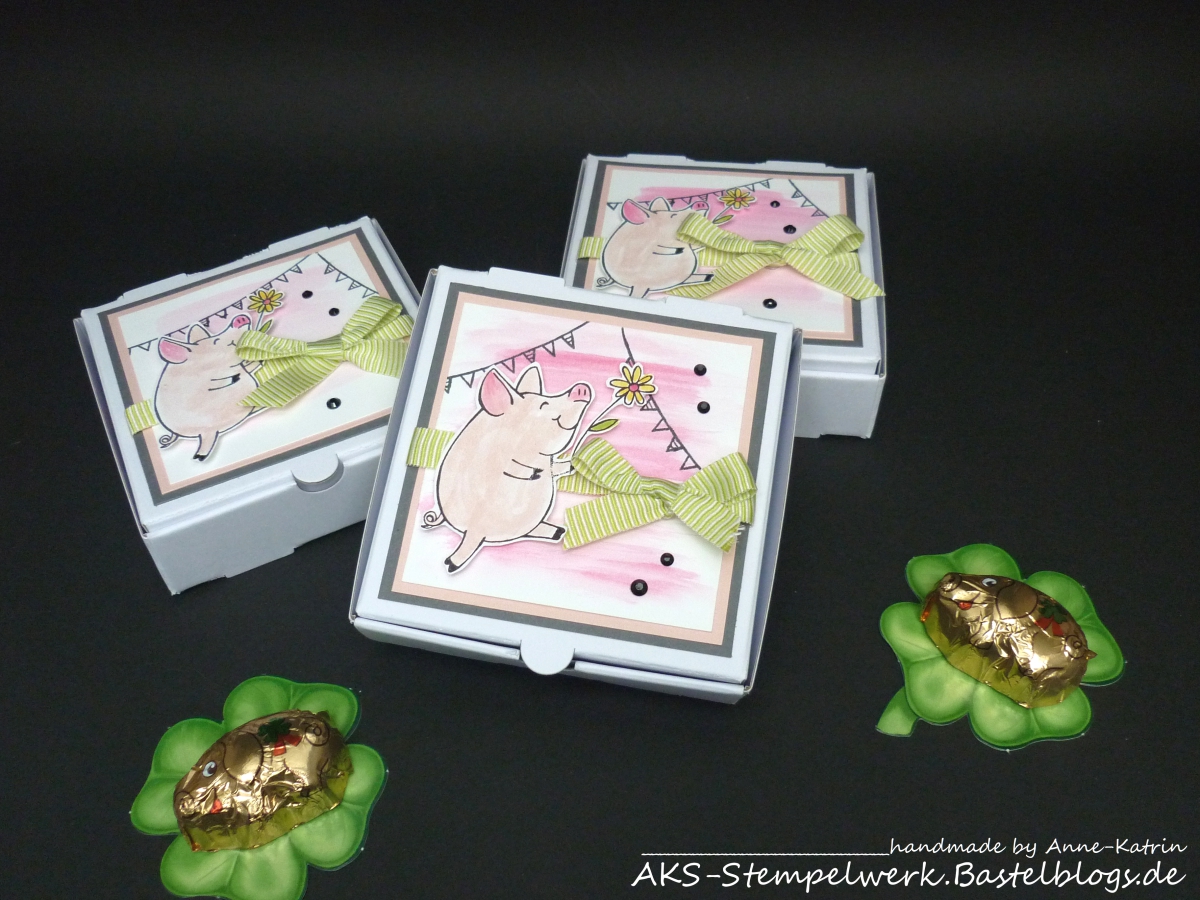 Und für innen habe ich mal den „Schredderkarton Geburtstagssoiree“ ausprobiert. Den gibt es im Pack gleich mit 3 verschiedenen Farben: pink, silber und weiß! Wie Du siehst, hab ich mich natürlich für pink entschieden 😉 Darauf dann das Schoko-Glücksschweinchen drapiert und fertig sind die Goodies für die Sammelbesteller!