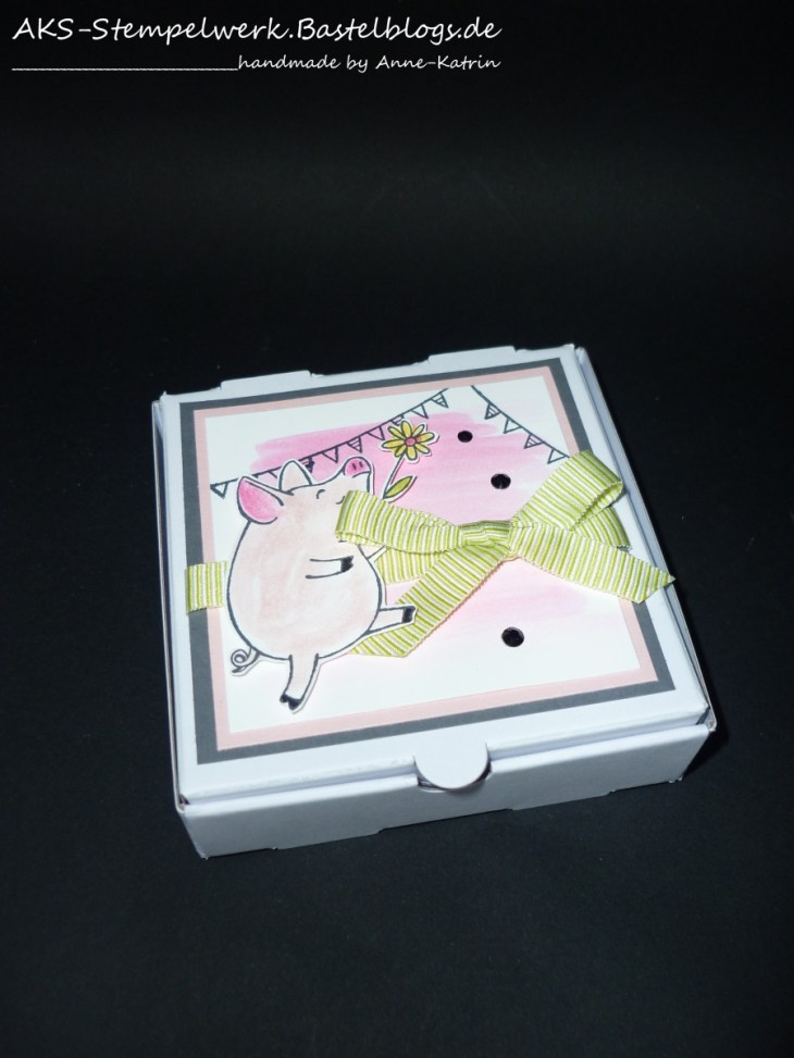 Als Verpackung habe ich die Minipizzaboxen, die Ihr aus dem Herbst-Winterkatalog kennt, gewählt, mit mehreren Lagen Cardstock aufgehübscht und als Abschluss ein Stück Flüsterweiß mit dem Aquapainter coloriert und mit den Wimpeln aus dem Set „In the Trees“ aus dem Frühjahr-Sommerkatalog bestempelt.