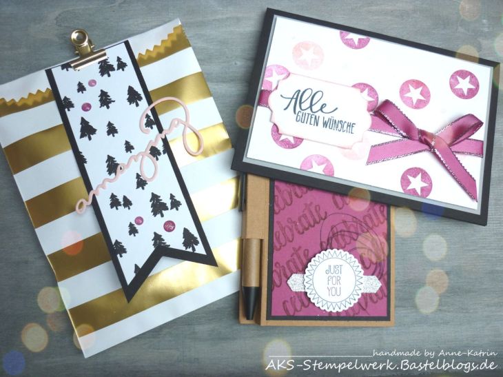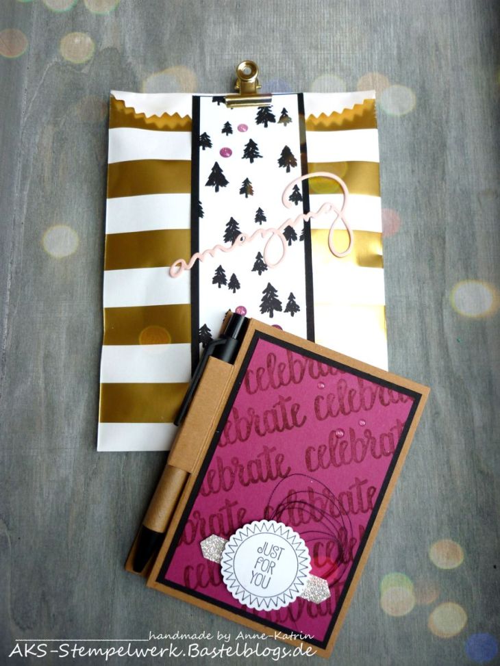 In farblicher Abstimmung habe ich noch ein kleines Notizbuch aufgehübscht und mal wieder unsere gold-gestreiften Geschenktüten verwendet. Wurde ja auch Zeit, schließlich habe ich meine herzallerliebsten Tütchen schon lange nicht mehr gezeigt *haha*.