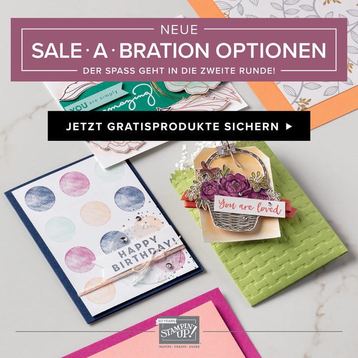 Hallihallo! Die Sale-A-Bration, eine unserer schönsten Aktionen, ist gerade auf ihrem Höhepunkt… die erste Hälfte ist bereits rum und für den 2. Teil gibt es nochmal einen Nachschlag von Stampin‘ Up!