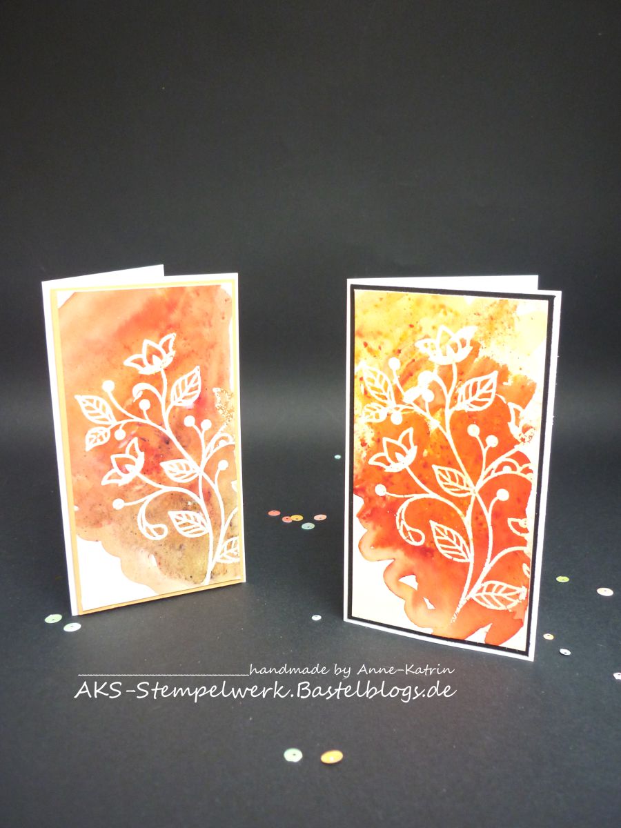Natürlich werden die Karten immer ganz individuell, weil ja auch der Farbverlauf nie gleich ist. Mit der Technik könnt Ihr allerdings etwas varrieren und herumprobieren. Ich habe hier die Ranke erst weiß embosst und dann mit dem Wassertankpinsel und den Pigmenten gearbeitet.