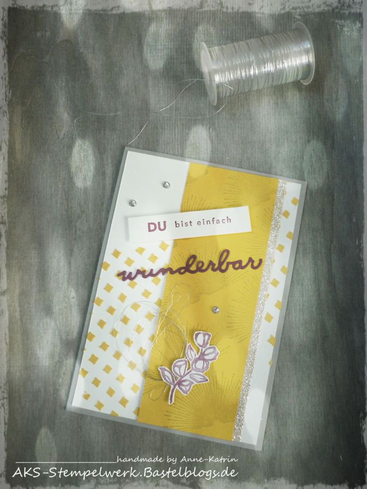 Die „Sonne“ auf dem gelben Cardstock-streifen, mit der ich auch wieder einen eigenen Hintergrund gestaltet habe, stammt wie der Text aus dem Stempelset „Einfach wunderbar“; die schon angesprochenen Stanzen gibt es in dem zugehörigen Set „Thinlits Formen Wunderbar“.