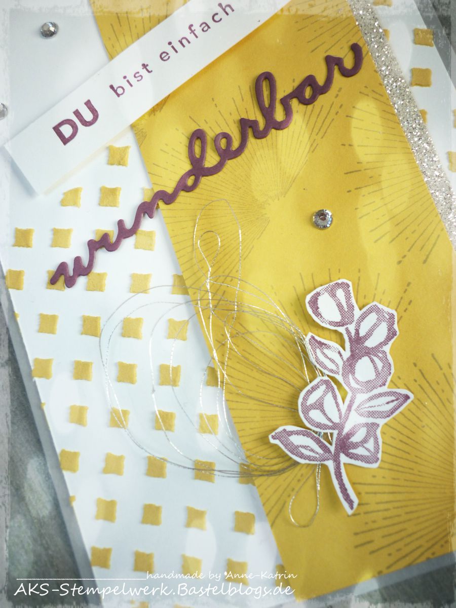 Die „Sonne“ auf dem gelben Cardstock-streifen, mit der ich auch wieder einen eigenen Hintergrund gestaltet habe, stammt wie der Text aus dem Stempelset „Einfach wunderbar“; die schon angesprochenen Stanzen gibt es in dem zugehörigen Set „Thinlits Formen Wunderbar“.
