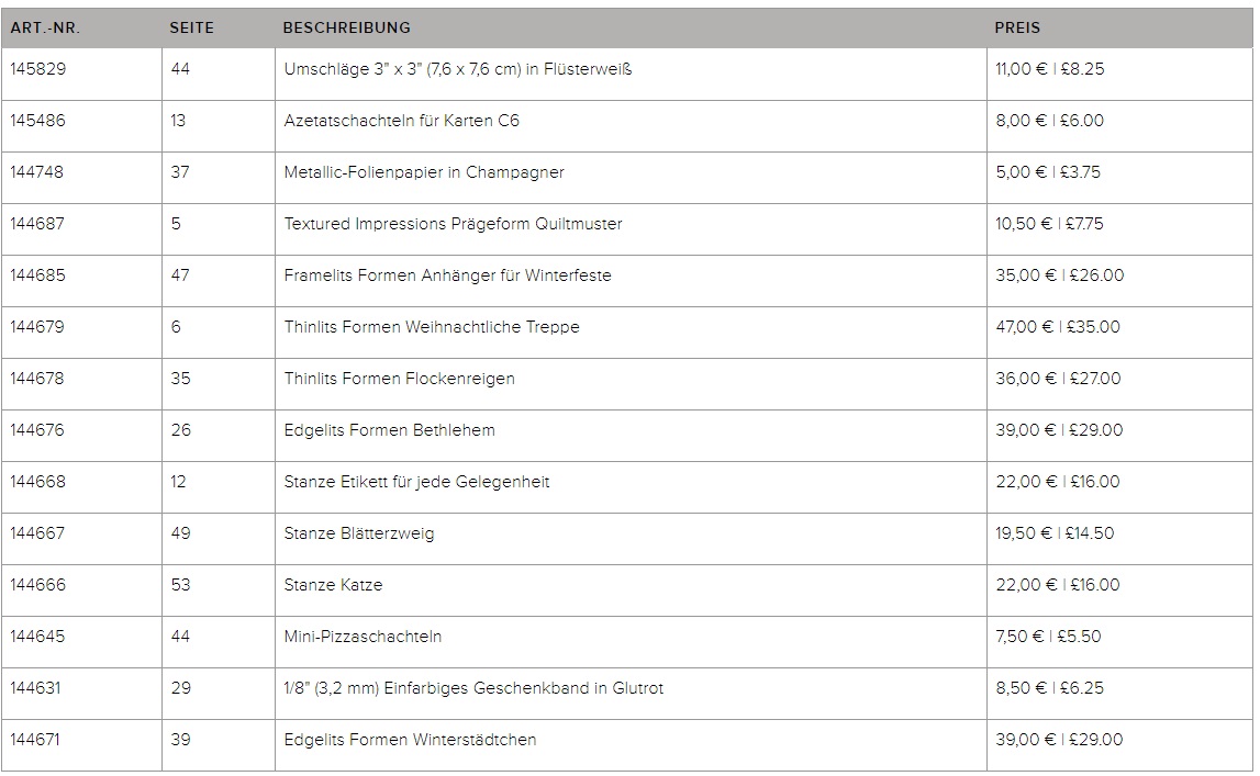 An dieser Stelle möchte ich daher auch nochmal an unsere übernommenen Produkte aus dem Herbst-Winterkatalog erinnern. Die Stempelsets sind zwar aktuell vielleicht nicht so interessant, aber das Zubehör erfreut sich immer noch großer Beliebtheit. (einfach auf die Liste zum Vergrößern klicken…)