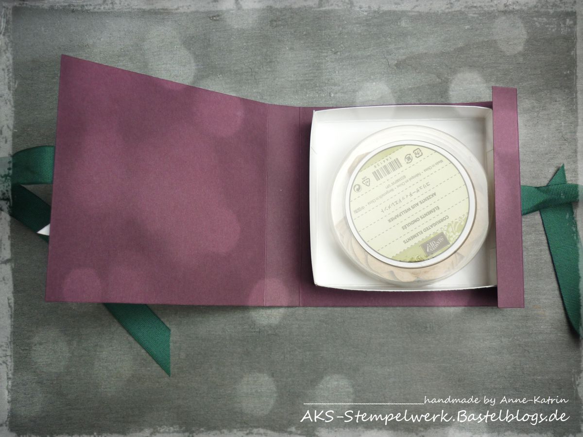Die Schleife ist die Incolor meeresgrün, ein toller Kontrast zu feige, oder? Sie wird ganz um die Box drumrum gebunden und unter dem Designerpapier versteckt.