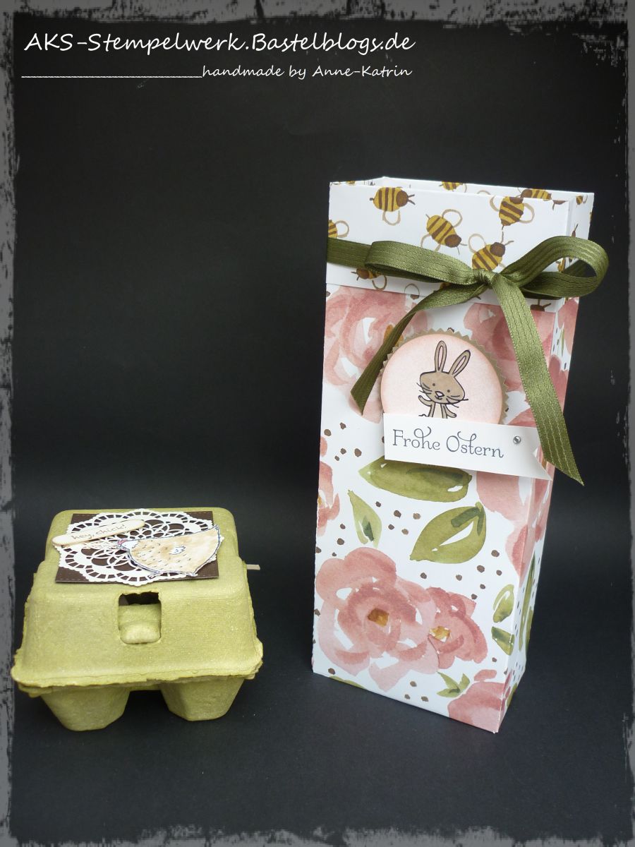 Der Eierkarton ist mit unserem Stampin‘ Spritzer eingefärbt und die Tüte ist mit dem Stanz- und Falzbrett für Geschenktüten (Hauptkatalog S. 204) gemacht. Dafür braucht Ihr nur einen 12″ Bogen Designerpapier Eurer Wahl und wenn Ihr mögt etwas Band.