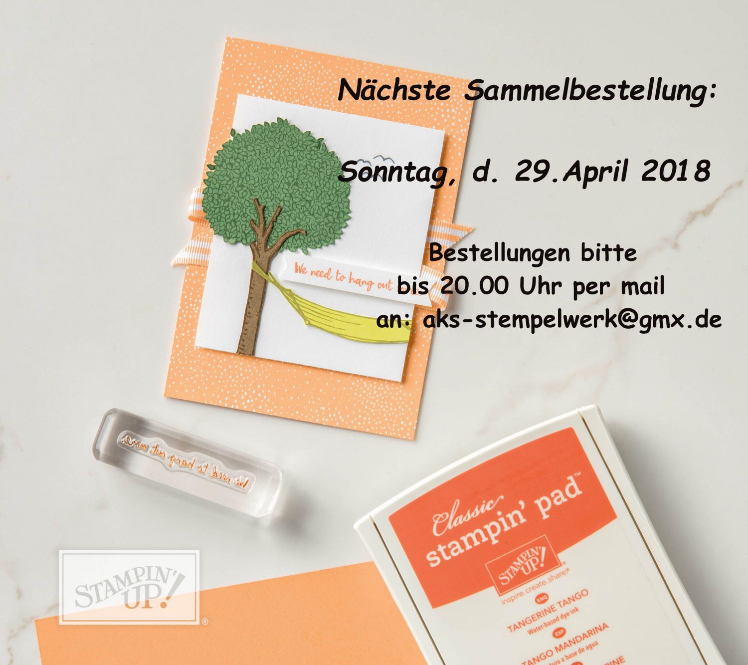 Falls Ihr noch ein paar Wünsche auf dem Herzen habt, zögert nicht, gönnt Euch doch einfach mal was. Der Monat ist eh bald rum… das lange WE steht vor der Tür…ach, Gründe gibt es doch genug 😉 Außerdem gibt es neben tollen Rabatten in der Ausverkaufsecke von Stampin‘ Up! auch noch süße Goodies für alle Sammelbesteller gratis von mir dazu 😉