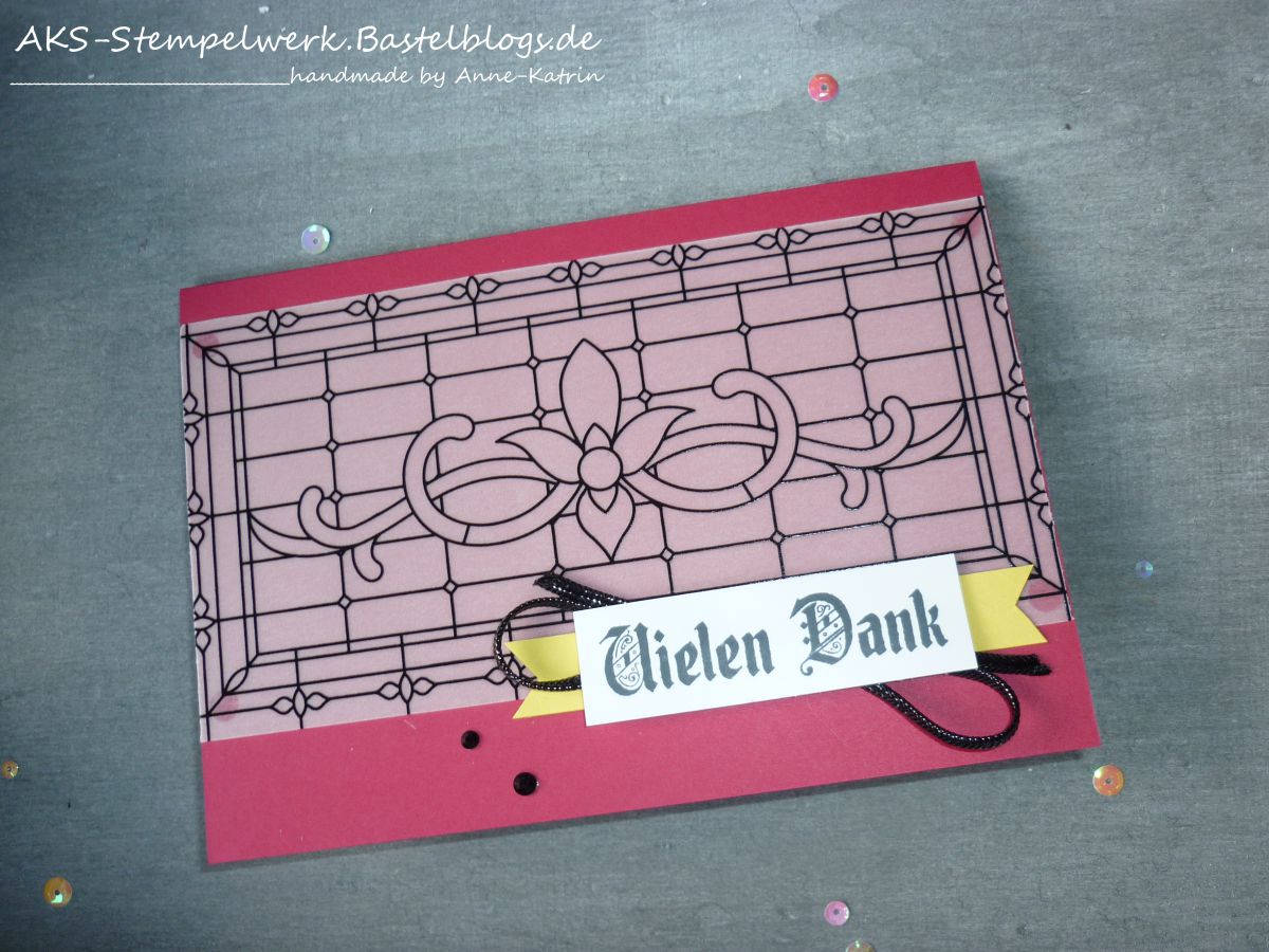 Hierbei gefiel mir vorallem das tolle neue schwarze Band, oder vielmehr Kordel. Mit dem Stempelset konnte ich nicht so viel anfangen – ich mag diese Schriftart nicht.