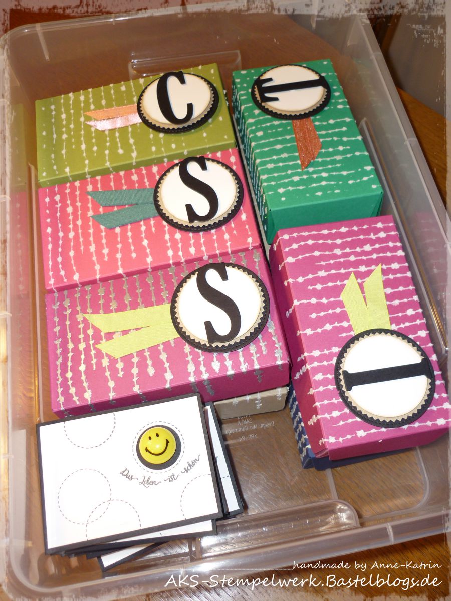 Ich hatte aus einem DIN A4-Bogen Cardstock in der jeweiligen Lieblingsfarbe der Mädels eine Box gewerkelt, die sich mit Magneten verschließen lässt und mit den großen Buchstaben jeweils personalisiert wurde. Das Muster ist mit der Strukturpaste aufgebracht. In dem Böxchen versteckte sich eine Baumwolltasche in schwarz, weiß, grau oder natur mit dem Lieblingsmotiv oder -tier. (jaaa, alles vorher abgefragt 😉 )