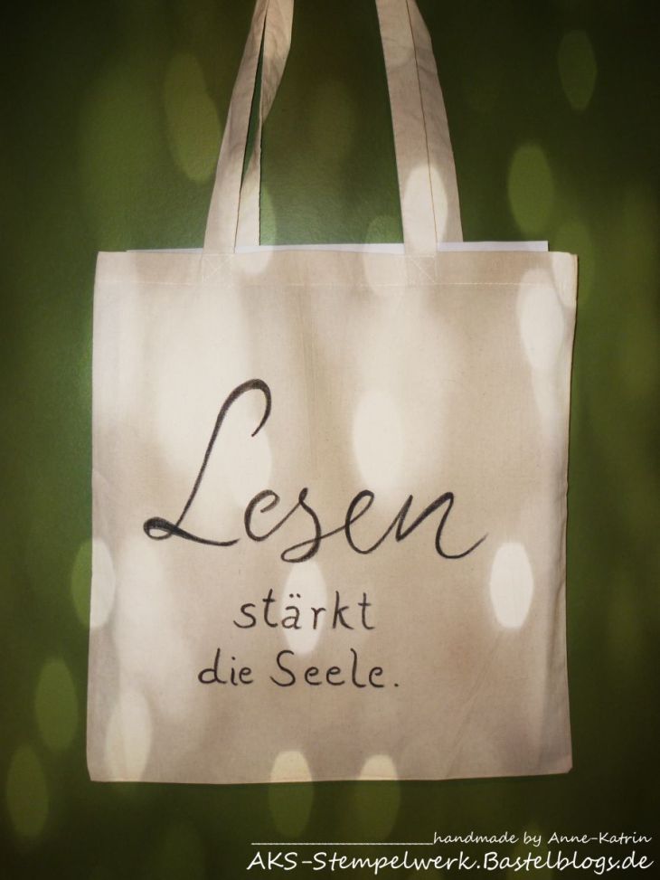 In zwei Fällen musste ich tatsächlich noch kurz vor’m Buchsenknopf selber Hand anlegen, weil ich einfach nirgends fündig geworden bin. Zum Thema „lesen“ habe ich eine Tasche mit diesem Spruch von Voltaire beschriftet: