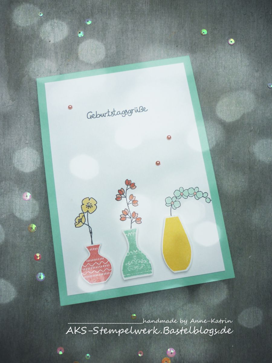 Die Vasen lassen sich super gut ausstanzen und mit 3d-Pads aufgeklebt zaubern sie ganz einfach etwas Tiefe auf die Karte 😉
