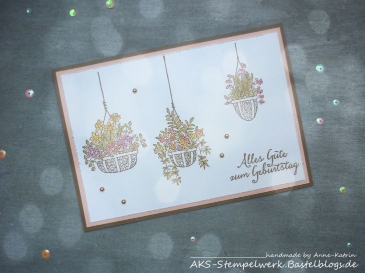 Hängender Garten… so heißt das Stempelset (S. 62) mit dem ich diese hübsche Geburtstagskarte gewerkelt habe. Der Name passt auch aktuell zu sämtlichen Pflanzen auf den Balkonen oder im Garten, was meint Ihr? Alles hängt und (ver-)trocknet vor sich hin…