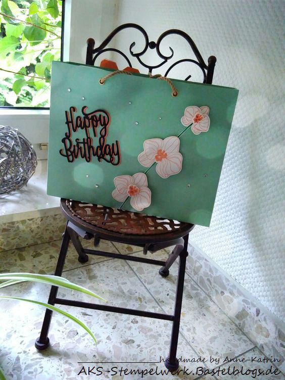 Zur Feier des Tages habe ich neulich diese Geschenktasche gewerkelt und mit den Stempeln und passenden Stanzen „Orchideenzweig“ (S. 24 im Jahreskatalog) verziert.