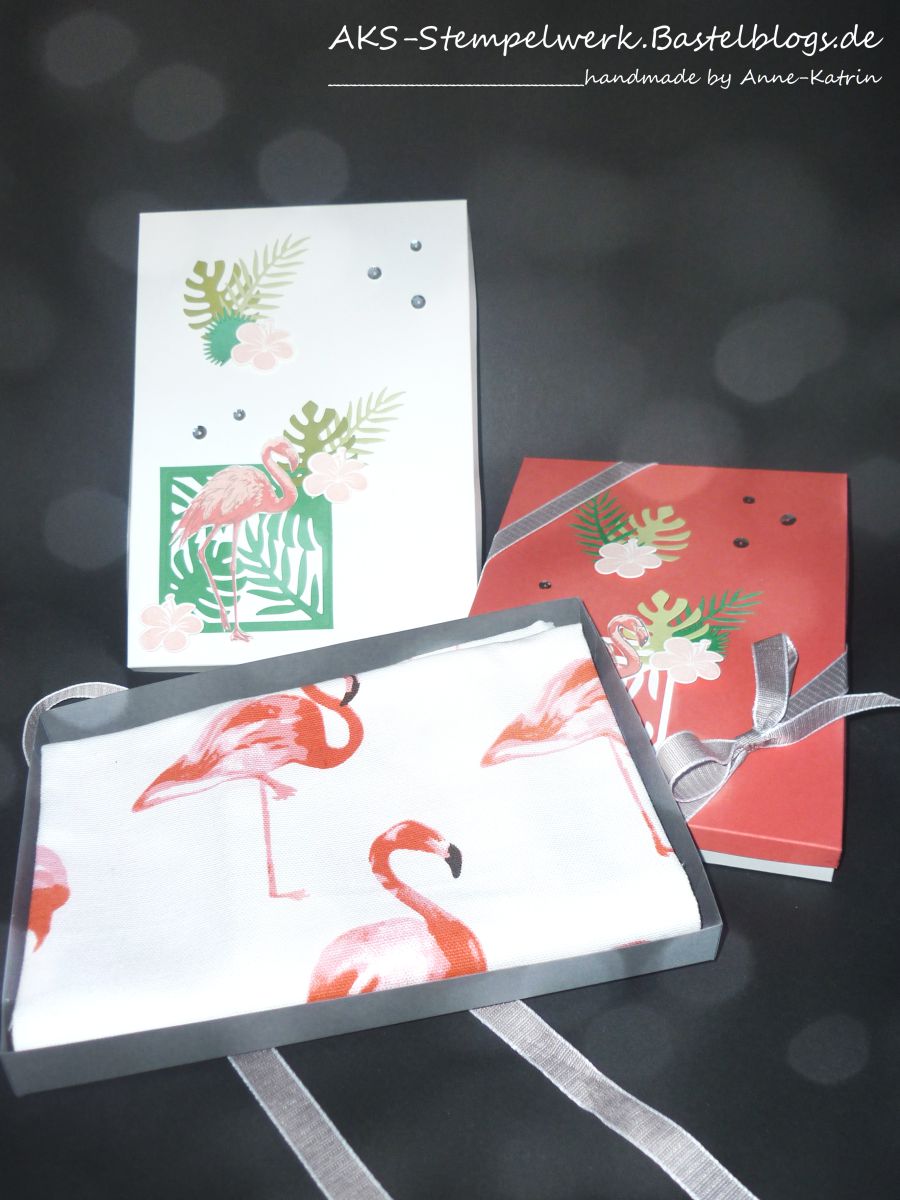 Passend zu den süßen Flamingo-Küchenhandtüchern, die ich gekauft hatte, wollte ich natürlich eine schöne Verpackung werkeln. Also habe ich das gute Stück zusammengelegt, abgemessen und dann eine kleine Box gebaut.