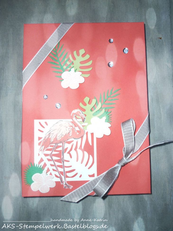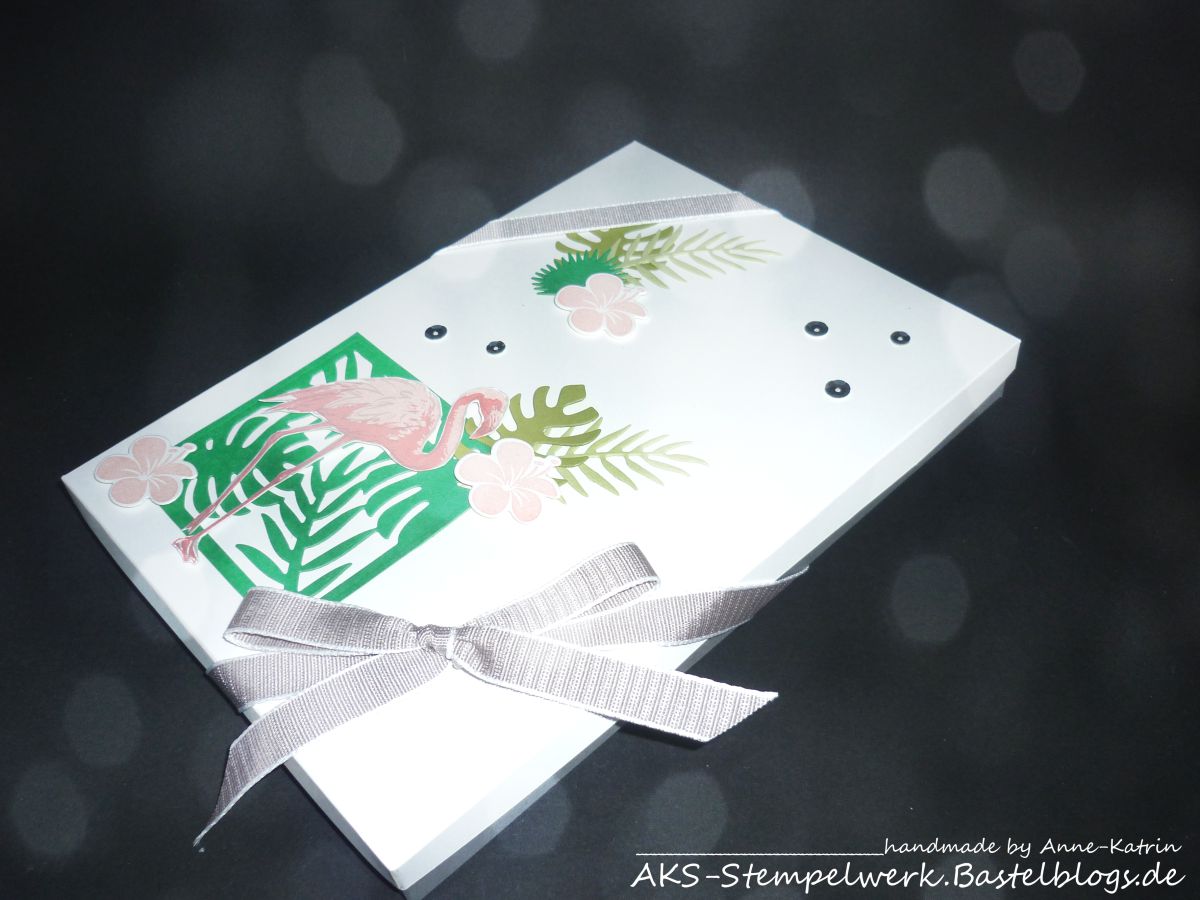 Der Deckel wurde dann mit den Sets „Tropenflair“ und „Flamingo-Fantasie“ verziert. Wie Ihr seht, kann ich mich nur schwer vom Sommer verabschieden 😉