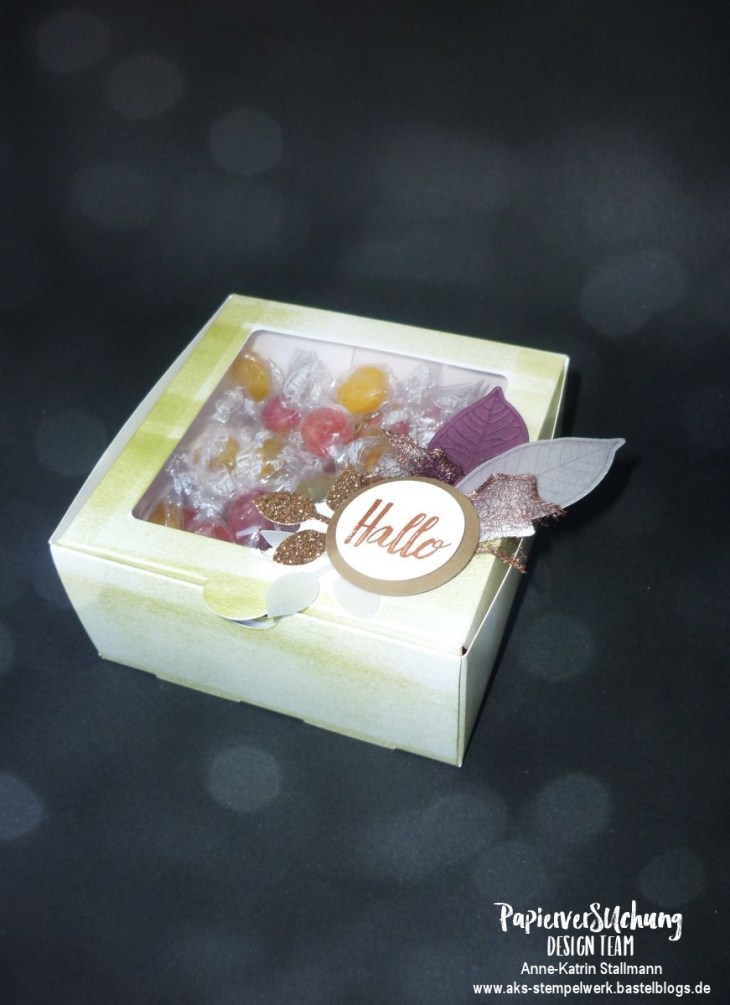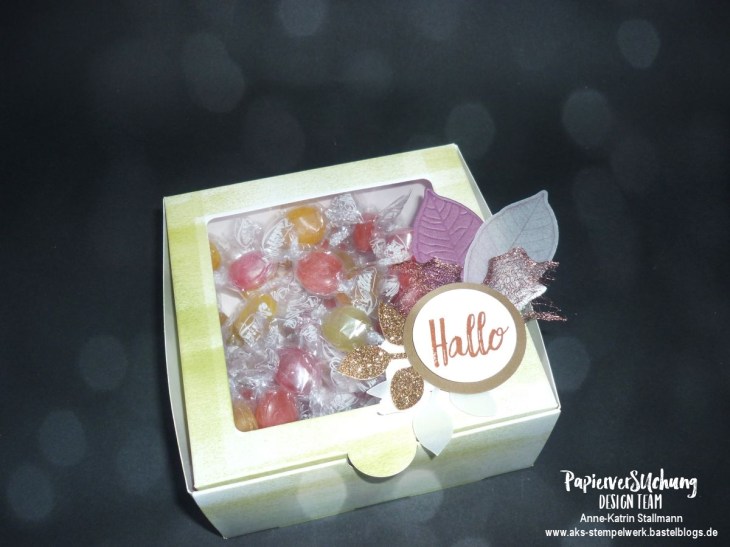 Ihr seht, im Nu war die kleine Süßigkeitenbox fertig und kann jetzt super als kleines Geschenk herhalten oder auch zur Begrüßung bzw. als Naschbox während eines kleinen Bastelabends oder Workshops dienen 😉