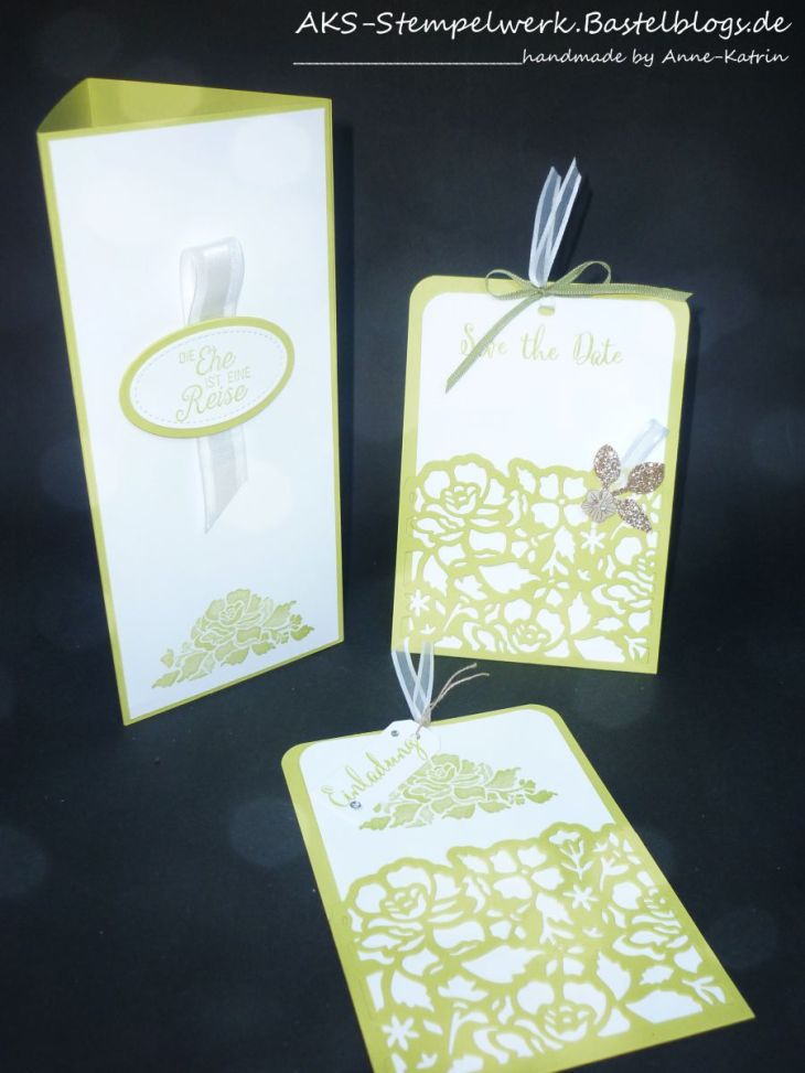 Auf dem nächsten Bild habe ich eine Komposition aus Menue- bzw. Tischaufsteller, Save the Date- und Einladungskarte erstellt, und zwar mal im frischen Limette-Farbton.