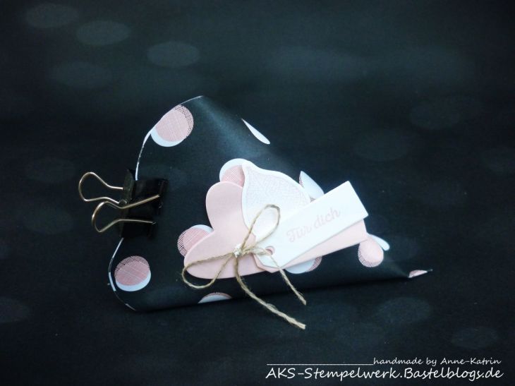 Möglich sind aber auch solche kleinen Gastgeschenke in Form einer Sourcreambox mit herzförmigem Abschluss. Verschließen lässt sie sich mit einer kleinen Klemme und sie ist groß genug für ein paar Bonbons, 1-2 Ferereo Rocher oder ein paar Hochzeitsmandeln.