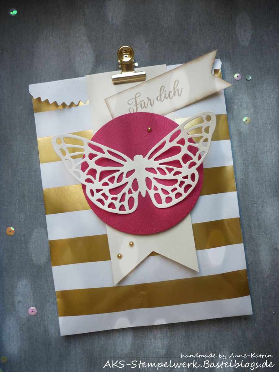 Hier habe ich einen ausgestanzten Kreis mit dem Prägefolder „Struktureffekt“ (Jahreskatalog S. 223) geprägt, den Schmetterling aus dem Set „Thinlits Frühlingsimpressionen“ (S. 219) ausgestanzt und nochmal verwendet, bevor die Schmetterlinge quasi den Winterschlaf antreten 😉 . Ein paar goldene Metallicperlen und ein kleines Fähnchen mit dem Schriftzug „Für Dich“ (aus dem Set „Wintermärchen“ aus der bevorstehenden November-Aktion ) komplettieren das Ganze!