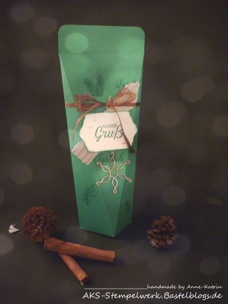 Dazu habe ich mir noch eine Schneeflocke aus den kupferfarbenen Accessoires „Drahtakzente“ aus dem Herbst-Winterkatalog und das farblich passende Geschenkband in Kupfer (Ihr findet es im Hauptkatalog auf S. 200) geschnappt und schon ist ein süßes Geschenk fertig!