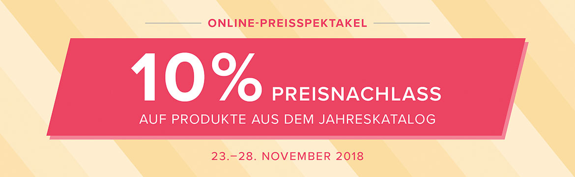 Das Online-Preisspektakel umfasst sechs Tage. In dieser Zeit gibt es drei 48-Stunden-Angebote, bei denen ausgewählte Produkte aus dem Jahreskatalog 2018–2019 mit einem Preisnachlass von 10 % zu haben sind! Jedes 48-Stunden-Angebot gilt für zwei Produktkategorien (wie Papier, Stempel, Tinte usw.). Sobald ein Angebot endet, beginnt das nächste – bis das ganze Online-Preisspektakel vorbei ist. Dann wird fast jeder Artikel aus dem Jahreskatalog im Angebot gewesen sein!