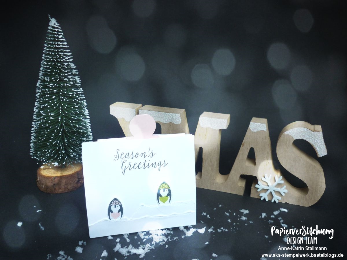 …und das ist vorallem winterlich mit den süßen Pinguinen 😉 Und die Pinguine wiederum stammen auch nicht aus dem Produktpaket „Leuchtende Weihnachten“, sondern quasi aus dem Schwestern-Stempelset „Making Every Day Bright“,  das natürlich ebenfalls zu der tollen Elementstanze Glühbirne passt. Ich konnte einfach nicht widerstehen und wollte diesmal etwas ganz schlichtes und nicht so überladenes werkeln, kurz gesagt: clean and simple!