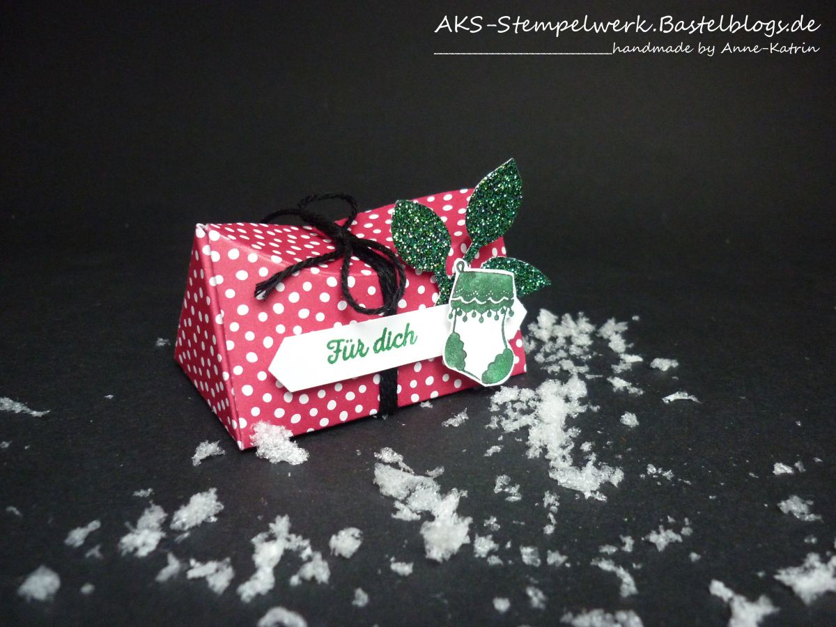 Ich habe das Designerpapier der InColor 2018-2020 verwendet, farblich entsprechendes „Glitzerpapier Weihnachtszeit“ (Herbst-Winterkatalog S.29) mit der Handstanze „Blätterzweig“ (Jahreskatalog S. 211) ausgestanzt und die kleine Socke aus dem Gastgeberinnenset „Adventsgruß“ (Herbst-Winterkatalog S.55) mit der Hand ausgeschnippelt. Das geht ganz fix. Der Spruch stammt aus dem Set „Klitzekleine Grüße“ (Jahreskatalog S. 46) und passt wunderbar auf die Handstanze „Klassisches Etikett“ (Jahreskatalog S. 210).