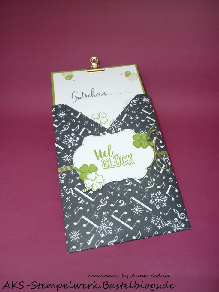 Dazu ein paar goldene Sprenkler aus dem Set „Sternstunden“ und ausgestanzte Kleeblätter aus goldenem Glitzerpapier…