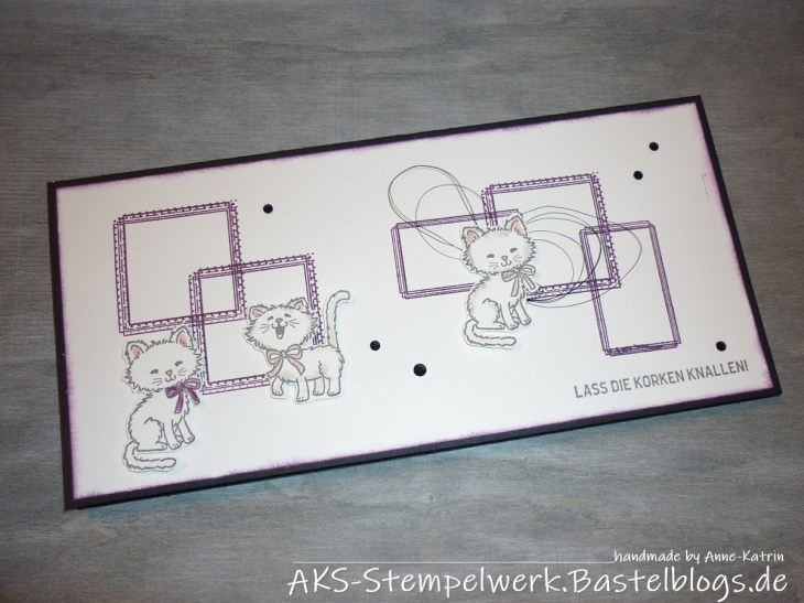 Die verwendeten Stempesets sind die „Swirly Frames“ (Jahreskatalog S. 137), „Pretty Kitty“ (Jahreskatalog S. 30) und das Set „Geburtstagsmix“ aus dem Frühjahr-Sommerkatalog (S. 16), aus dem der tolle Spruch stammt.