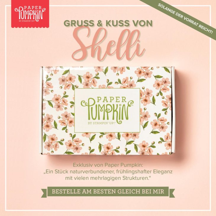 Seit heute gibt es ja das Paper Pumpkin-Set endlich auch für uns in Deutschland zu bestellen; eine erste Bestellung ist schon raus. Hast Du auch Interesse an diesem kleinen Überraschungspäckchen zum Karten basteln, das Shelli selbst mit kreiert hat?
